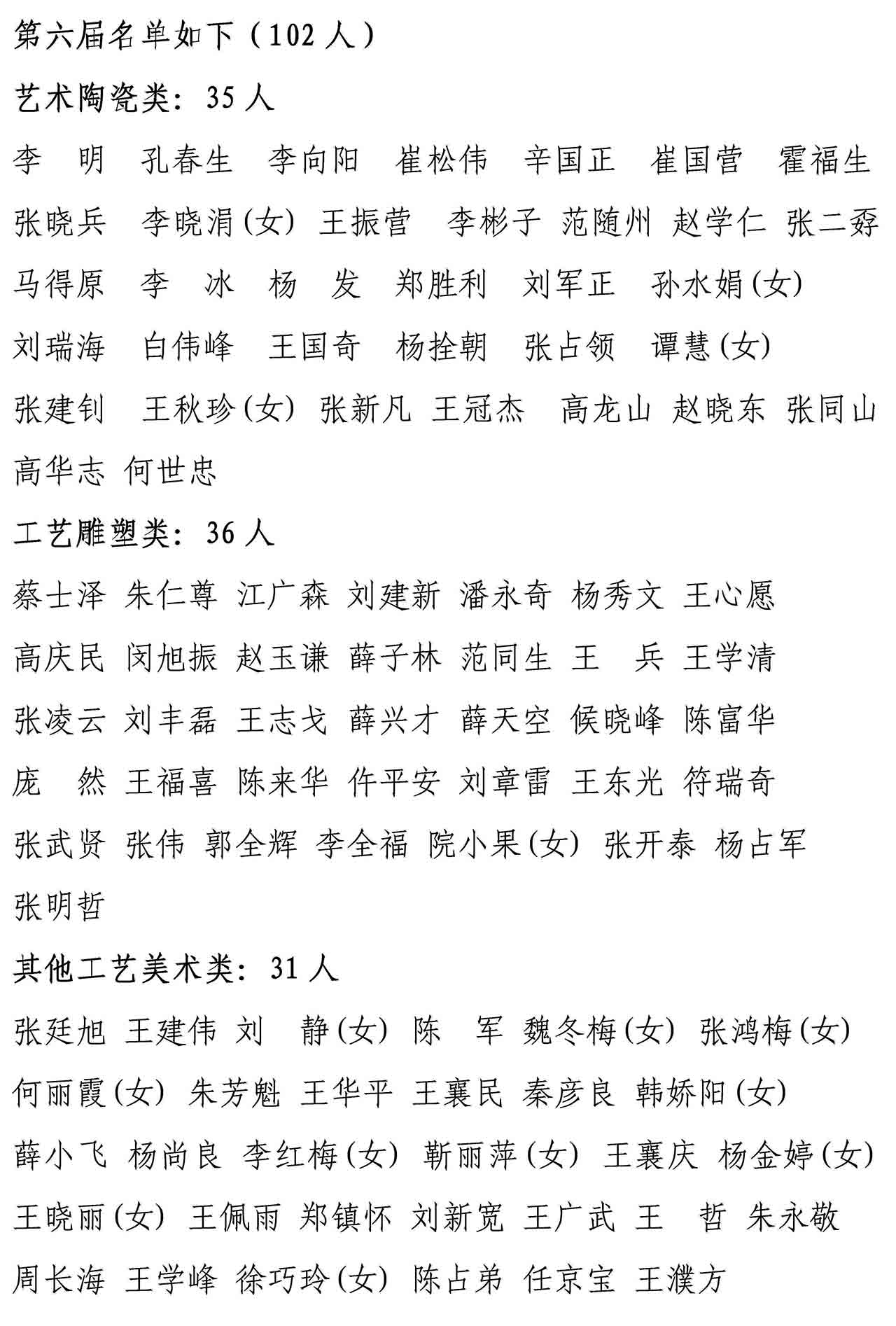 2010年河南省工业和信息化厅下发了"关于开展第六届河南省工艺美术大师评审工作的通知"(豫工信〔2010〕165号)。依据《河南省传统工艺美术保护办法》(省政府令118号)第七条规定"省工艺美术行业协会承担评审的具体事务"。2011年河南省人民政府授予102位同志第六届河南省工艺美术大师荣誉称号(豫政〔2011〕43号)。