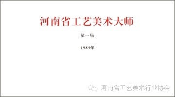 1989年10月原河南省轻工业厅、河南省科学技术委员会下发"关于颁发'河南省工艺美术大师'荣誉称号评定的暂行规定的通知(予轻字(89)31号文)"。根据通知要求,原河南省轻工业厅下发了"关于建立'河南省工艺美术大师'评审委员会的通知(予轻字(89)第38号)",开始"评审第一批河南省工艺美术大师"。原省轻工业厅厅长孙光华同志任评审委员会主任,省工艺美术公司总经理、省工艺美术行业协会理事长黄兴等同志任副主任。